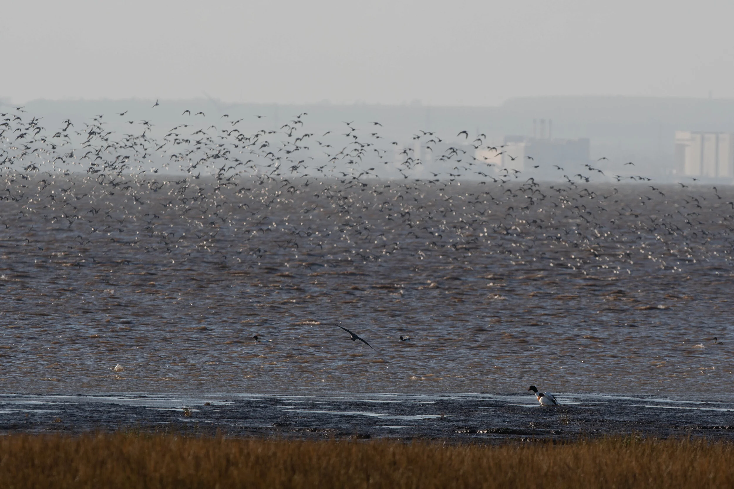 By now the tide had come right in and all of the waders were congregated along the shoreline. This provides the perfect opportunity for peregrine falcons to hunt. So it proved-an almighty commotion erupted as thousands of waders were scattering in all directions as a peregrine falcon dive bombed them repeatedly. What a spectacular sight! It carried on for about 10 minutes and just when I was beginning to think it might be unsuccessful it literally stuck out a foot and plucked an unfortunate wader (looked like a bar tailed godwit but was quite distant) out of the sky. It then settled on the salt marsh to devour its catch and the show was over.